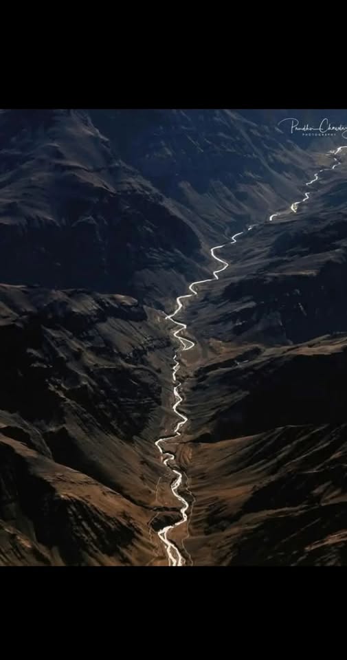 ఈ ఫోటోలో దృశ్యం కేవలం ఒక నది ప్రవాహం మాత్రమే కాదు, భారతదేశ ఆత్మ యొక్క సజీవ సంగ్రహావలోకనం. ఇది సింధు నది – లడఖ్ యొక్క నిర్జనమైన మరియు కఠినమైన పర్వత శ్రేణుల గుండా నిశ్శబ్దంగా ప్రవహిస్తుంది, కాలపు ఛాతీపై ప్రకాశవంతమైన కుట్టులాగా. సూర్యకిరణాలలో మెరుస్తున్న ఈ ప్రవాహాలు వెండి చారల వలె కనిపిస్తాయి, గోధుమ-ఊదా పర్వతాల మధ్య జీవితాన్ని సూచిస్తాయి.